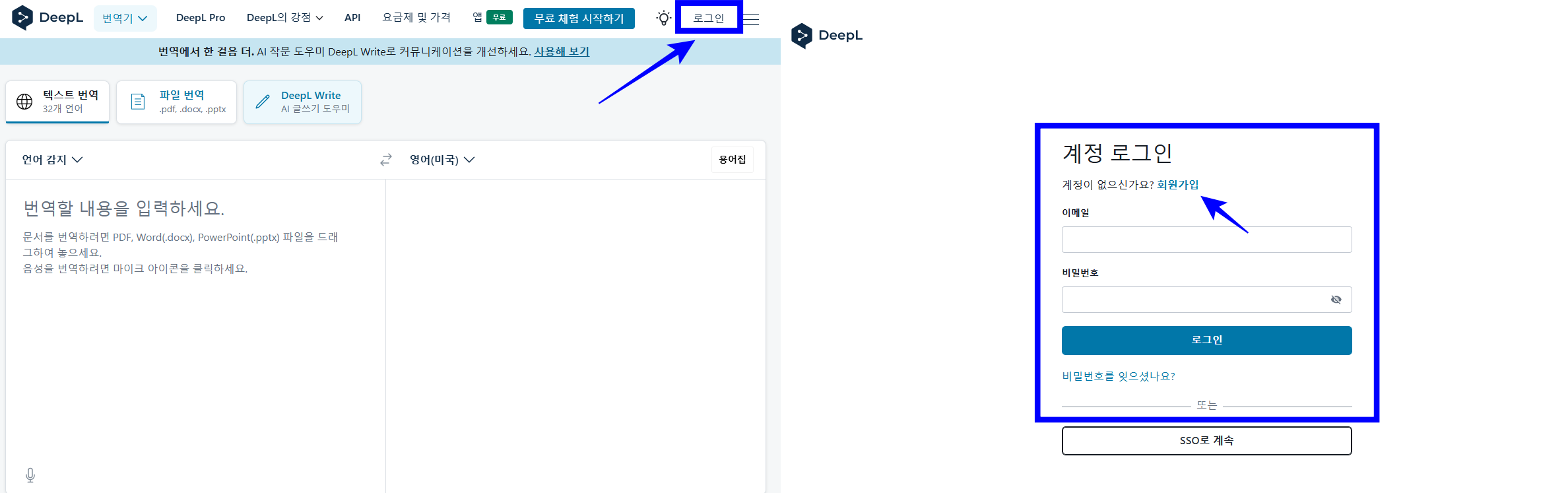 - 이메일 주소와 비밀번호를 입력하면 간단히 회원가입할 수 있는데요. 회원가입을 하지 않아도 간단한 번역은 가능합니다.