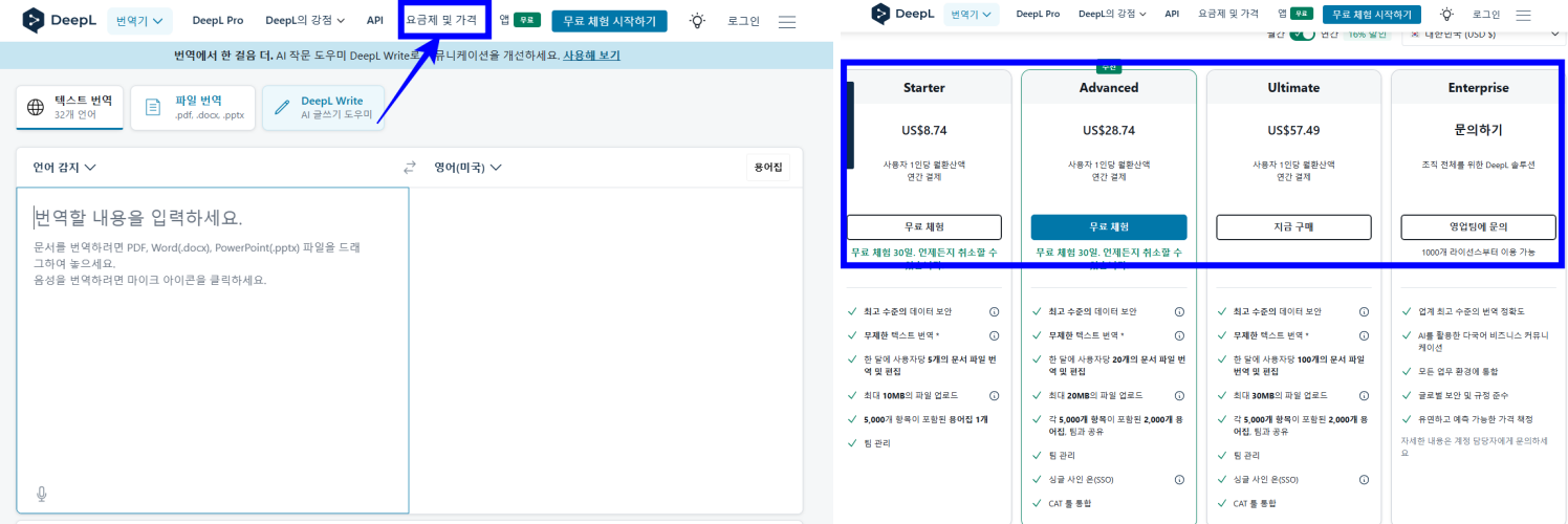 - DeepL Pro 는 고급 사용자용 기능으로 유료 서비스입니다. Pro 버전 가입하면 더 높은 번역 속도와 정확도, API 접근 등을 할 수 있어요. 가입은 웹사이트에서 가능하고요. 요금제는 starter 부터 Enterprise 까지 다양합니다. Starter와 Advanced는 30일 무료체험 가능하니까 참고하세요! 사실 크게 전문 번역이 필요한게 아니면 Starter로도 충분하긴 하더라고요. 논문 보거나 할때는 좀 더 비싼 요금제를 사용하면 편하고요.